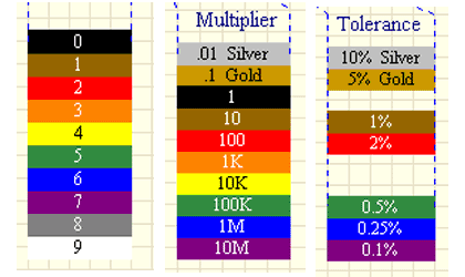 Điện trở thường được ký hiệu bằng 4 vòng mầu , điện trở chính xác thì ký hiệu bằng 5 vòng mầu.