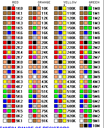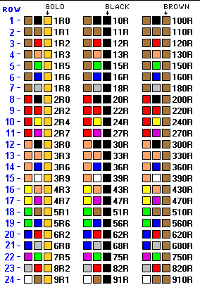 Ở hình trên là các giá trị điện trở ta thường gặp trong thực tế, khi vòng mầu số 3 thay đổi thì các giá trị điện trở trên tăng giảm 10 lần.