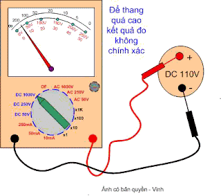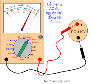 Nếu ta để sai thang đo, đo áp một chiều nhưng ta để đồng hồ thang xoay chiều thì đồng hồ sẽ báo sai, thông thường giá trị báo sai cao gấp 2 lần giá trị thực của điện áp DC, tuy nhiên đồng hồ cũng không bị hỏng .