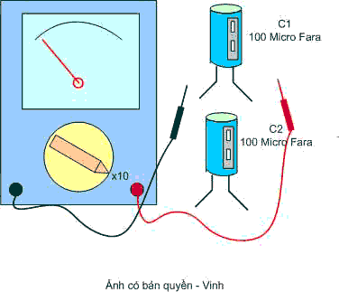 Ở trên là phép đo so sánh hai tụ hoá cùng điện dung, trong đó tụ C1 là tụ mới còn C2 là tụ cũ, ta thấy tụ C2 có độ phóng nạp yếu hơn tụ C1 => chứng tỏ tụ C2 bị khô ( giảm điện dung ) Chú ý khi đo tụ phóng nạp, ta phải đảo chiều que đo vài lần để xem độ phóng nạp.