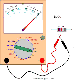 Bước 3 : Đặt que đo vào hai đầu điện trở, đọc trị số trên thang đo , Giá trị đo được = chỉ số thang đo X thang đoVí dụ : nếu để thang x 100 ohm và chỉ số báo là 27 thì giá trị là = 100 x 27 = 2700 ohm = 2,7 K ohm