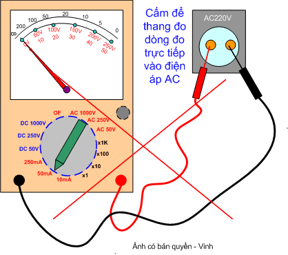 Tuyết đối không để thang đo điện trở hay thang đo dòng điện khi đo vào điện áp xoay chiều => Nếu nhầm đồng hồ sẽ bị hỏng ngay lập tức !