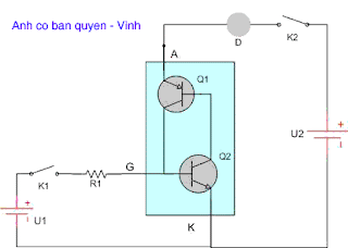 Khi công tắc K1 đóng, điện áp U1 cấp vào chân G làm đèn Q2 dẫn => kéo theo đèn Q1 dẫn => dòng điện từ nguồn U2 đi qua Thyristor làm đèn sáng.