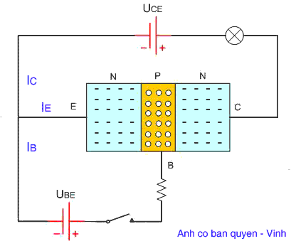 Ngay khi dòng IB xuất hiện => lập tức cũng có dòng IC chạy qua mối CE làm bóng đèn phát sáng, và dòng IC mạnh gấp nhiều lần dòng IB